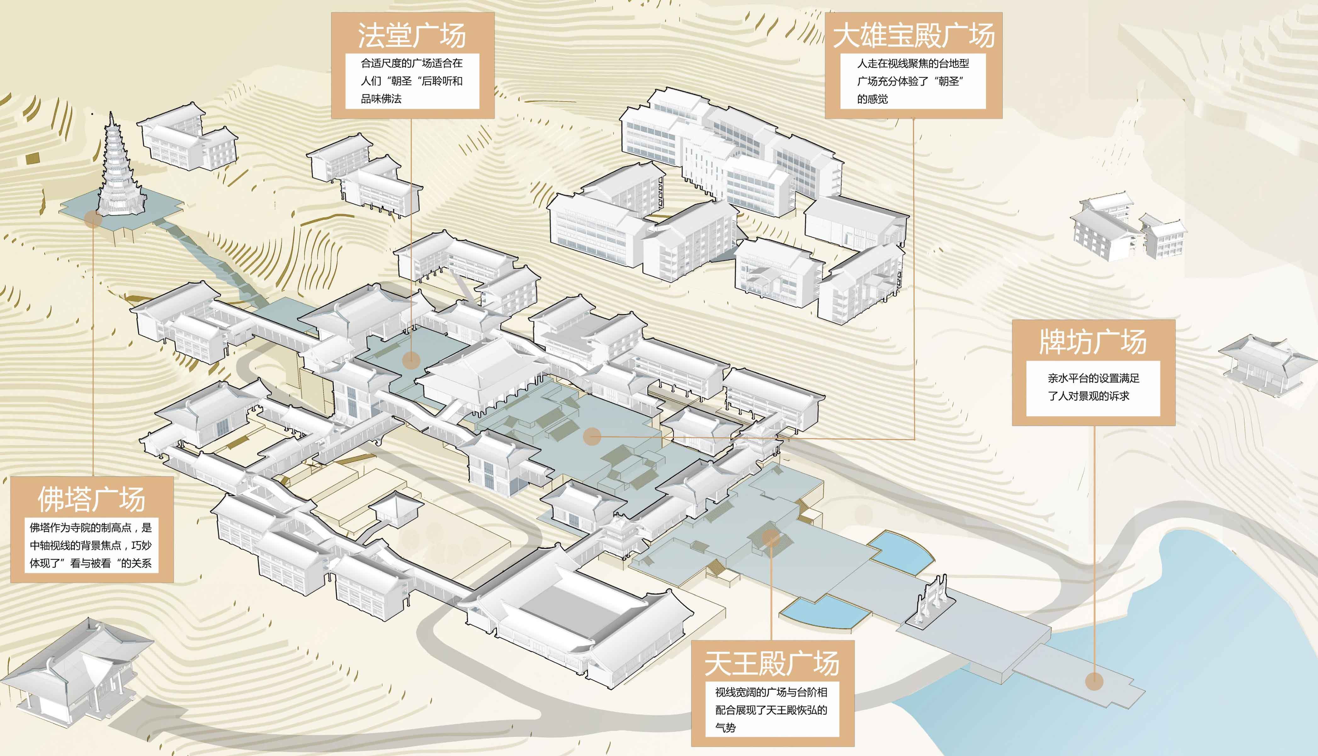 入口前区、生态湖区、中心礼佛区、