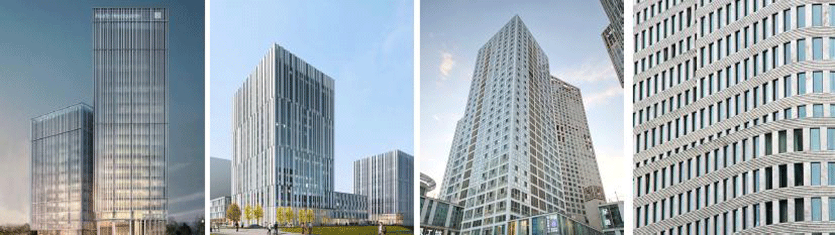 将板式塔楼分隔成竖向体块,并进行横向的划分,使形体更加均衡。增加横向铝板线条,深化形体。增加宽细线条的对比,使其交错均衡的分布在立面上。