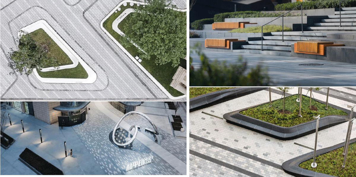 在铺装、景观墙体等构筑物的处理上,将传统与现代的景观材料进行合理的搭配,体现中国现代的景观设计,如传统的瓦片、青砖、卵石和现代的石材、金属、玻璃等材料结合在一起,在肌理、颜色、质感等方面形成对比和反差效果,达成和谐统一、简洁大气。