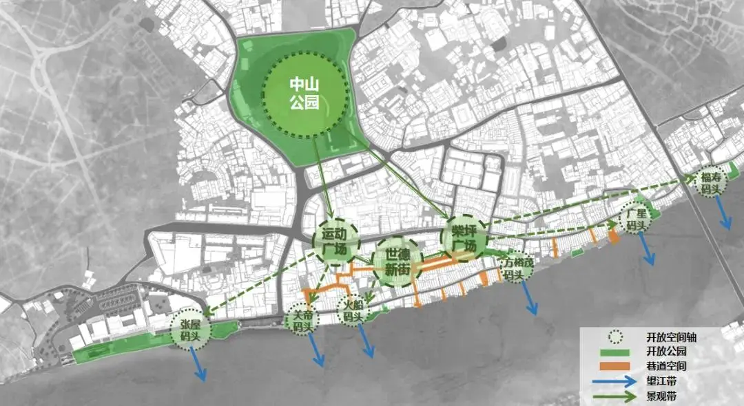 骑楼街呈现鱼骨状肌理街道平行梅江而建,激活古街旧巷,形成不同空间感受的特色游径,贯通各个开放性空间,且有多个巷道可通往梅江,形成开放性空间或望江节点。同时可利用危房改造为公共空间,结合街巷道,把“阳光”引入片区。