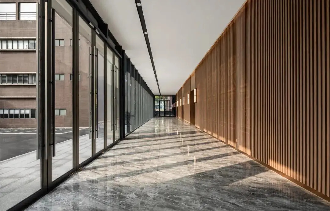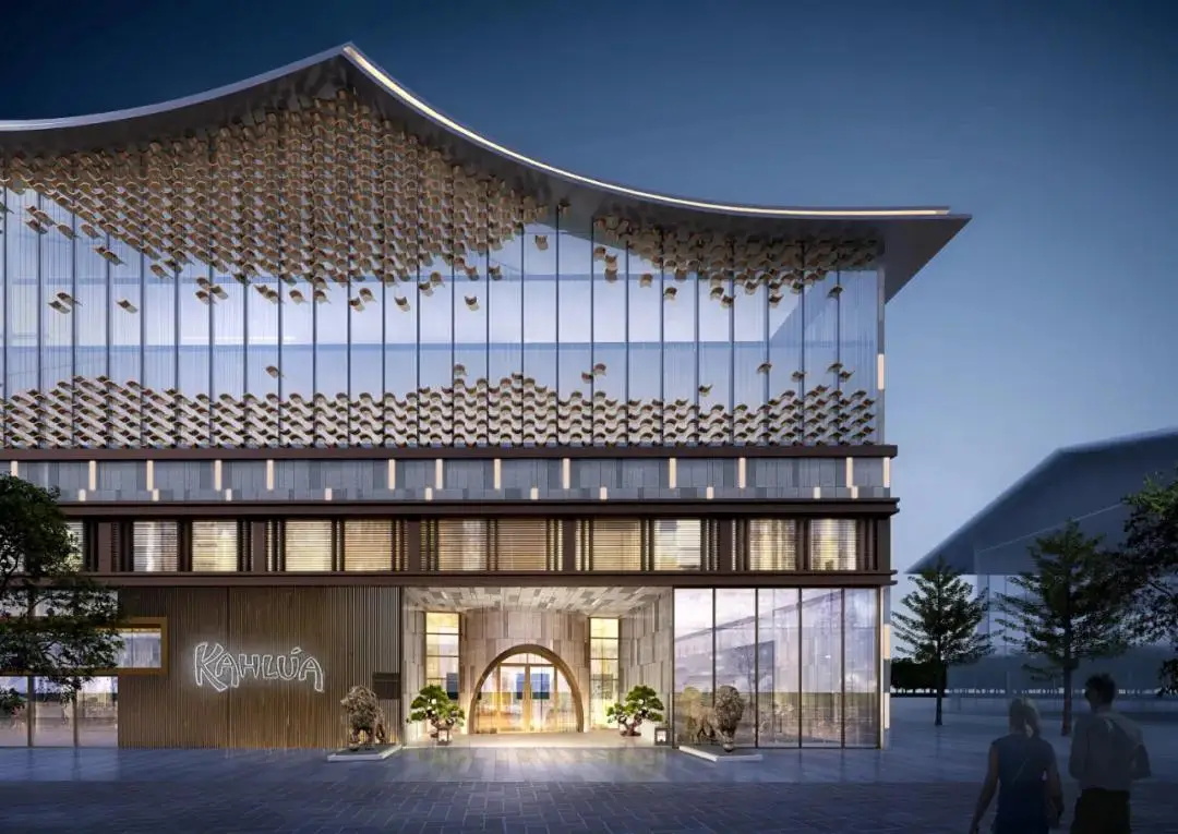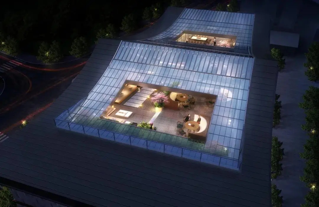 建筑改造采用现代中式风格,以青砖毛石营造中式建筑重色基底,再采用仿木构件、大面积落地玻璃等亮色点缀,形成有机虚实对比,通过直线、弧形、构架等手法突显其明快。整体建筑立面既有传统中式建筑的沉稳大气,又不失现代建筑的灵动活力。