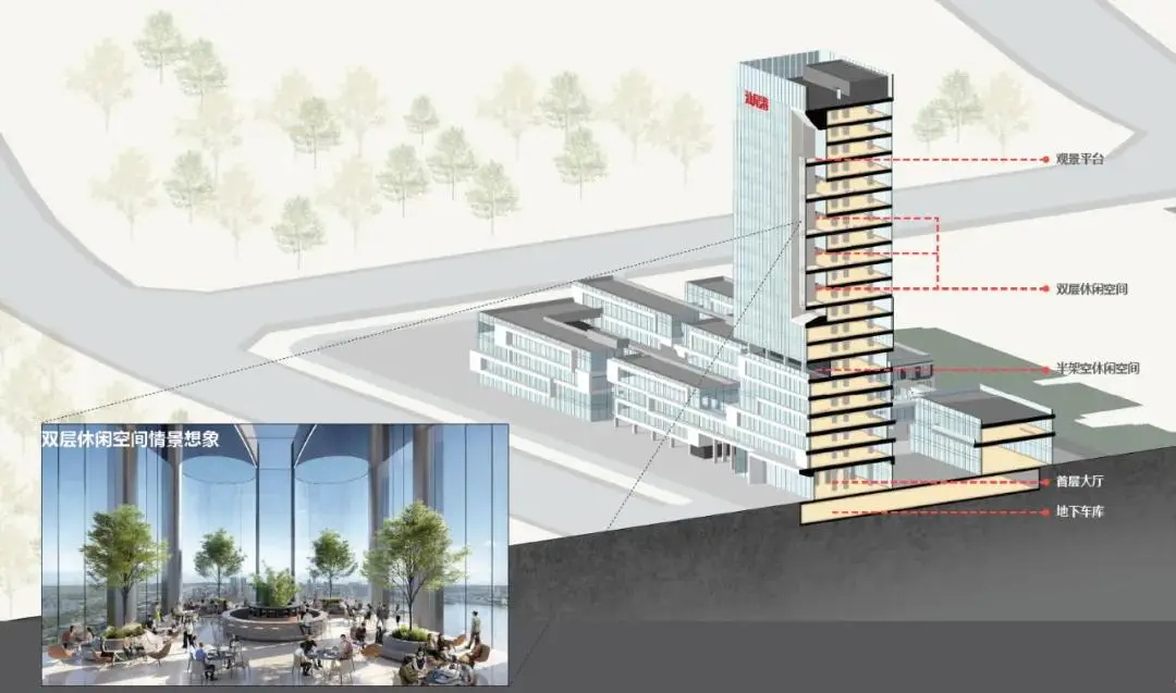 每层候梯厅正对“灯塔造型”,打造富有仪式感的企业前台,是平面设计的一大特色;裙楼为U型布置,使得入口大堂、办事大厅和食堂三者可以保持独立;宿舍区则采用了单边布置房间的做法,相对于双边布置品质更高。