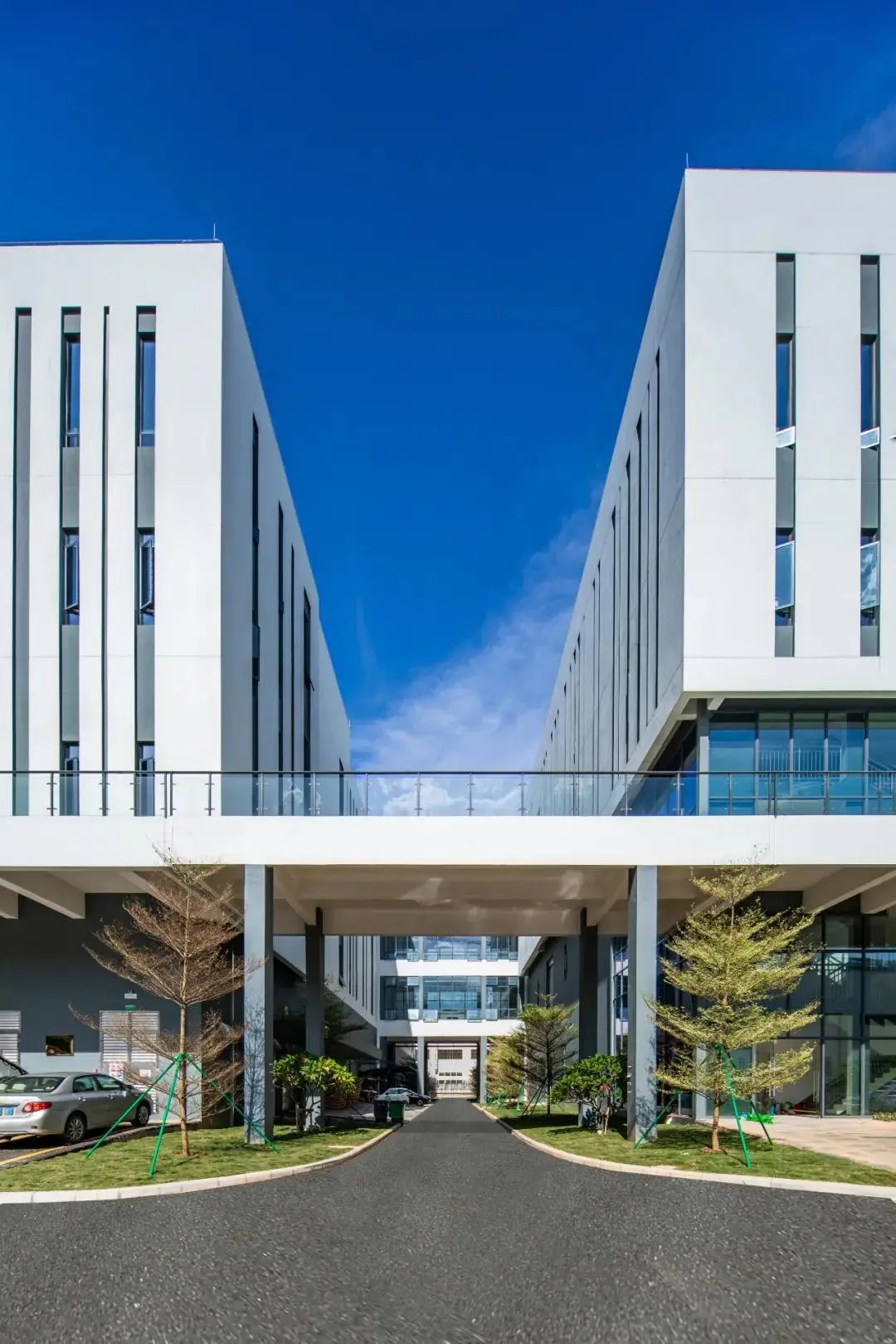建筑立面突破以往厂房简单呆板的设计,从艺术和功能结合出发,创造虚实有致、体块鲜明、元素纯净的工业建筑。外立面以米白色为主,灰色为体块划分和小量玻璃幕墙空间点缀,如同会呼吸的建筑“鱼鳃”。精心设计的细部节点,从设计到施工落地的精细化管理,充分体现了理性、精湛的工业之美。